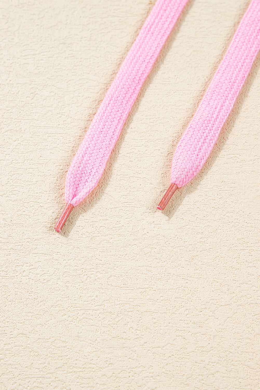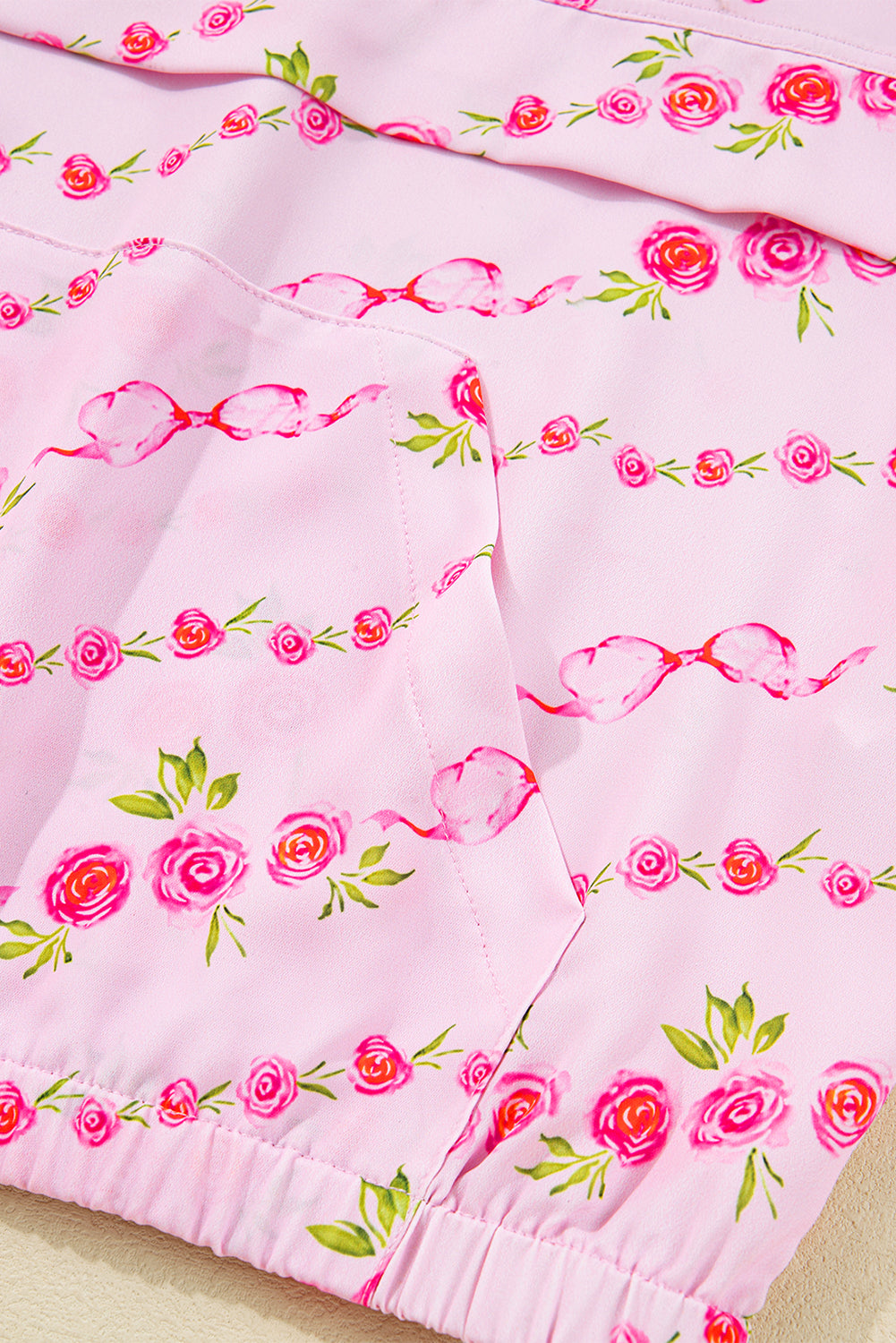 Pink Floral Print Half Zip Kangaroo Pouch Drawstring Hoodie