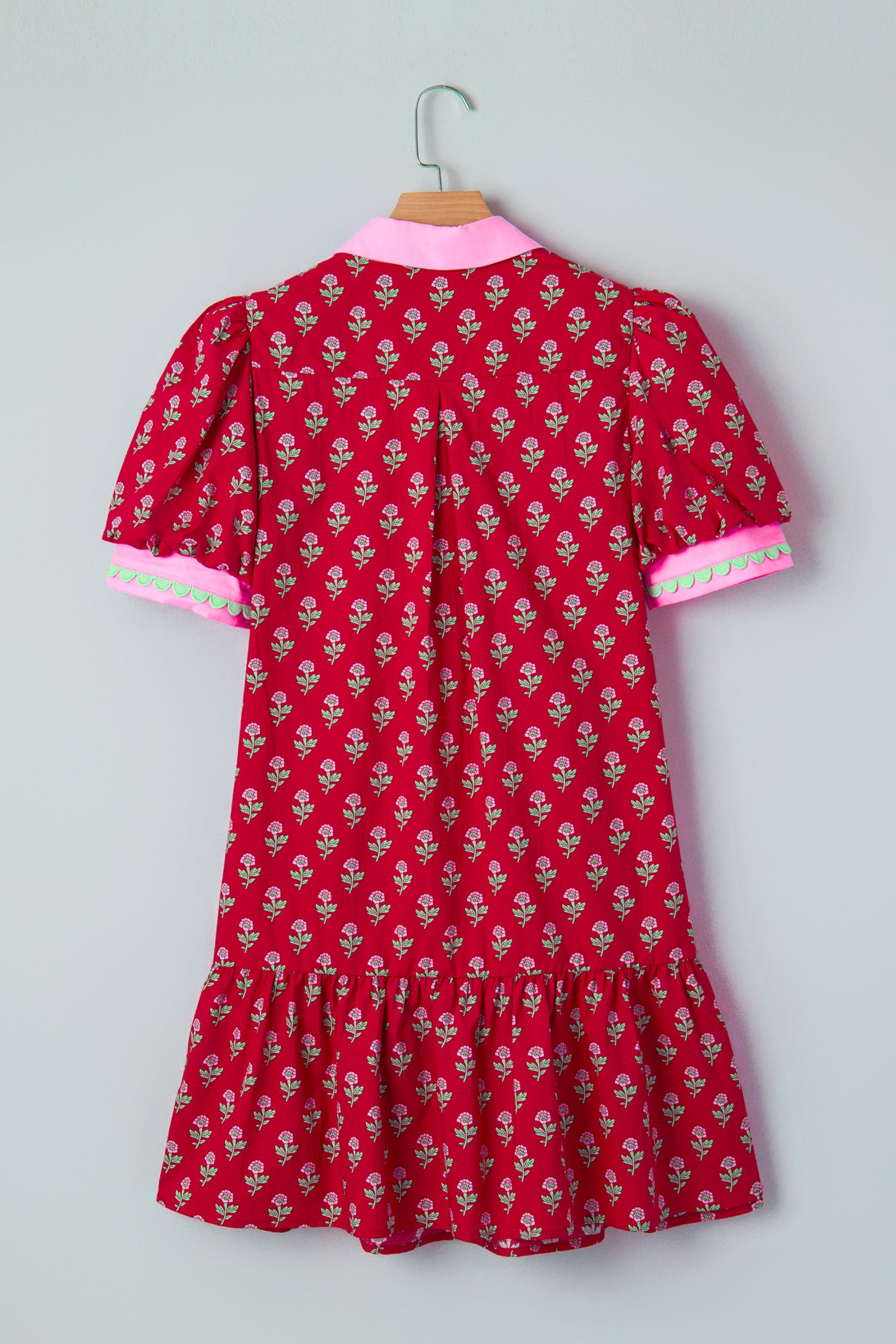 Red Floral Print Contrasted V Neck Short Bubble Sleeve Mini Dress